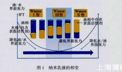 一般來(lái)說(shuō),納米乳液分為3種類型,即油包水型納米乳液(簡(jiǎn)稱W/O)、水包油型納米乳液(簡(jiǎn)稱O/W)和雙連續(xù)型納米乳液。Winsor根據(jù)油相或水相是否連續(xù)對(duì)納米乳液進(jìn)行分類,如圖1所示,即WinsorⅠ型是油包水型納米乳液,表面活性劑存在于水相中;WinsorⅡ型是水包油型納米乳液,表面活性劑存在于油相中;WinsorⅢ型是通過(guò)表面活性劑吸附界面膜作用形成的雙連續(xù)相體系,油相水相相對(duì)平衡,同時(shí)WinsorⅢ型納米乳液在高濃度表面活性劑作用下不能完全溶解油水,因此產(chǎn)生了WinsorⅣ型單相納米乳液,該體系中油相和水相總量大致相同;其中WinsorⅣ型和WinsorⅢ型均是超低界面張力的納米乳液。