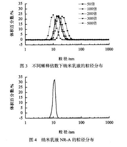利用英國(guó)馬爾文2000激光粒度儀采用濕法進(jìn)行微乳液粒徑測(cè)量。圖3為微乳液在不同稀釋倍數(shù)下得到納米乳液的粒徑分布。從圖3可知,微乳液稀釋50倍時(shí)得到的納米乳液粒徑D50為10~50 nm;微乳液稀釋500倍時(shí)納米乳液粒徑D50為5~20 nm;微乳液粒徑隨稀釋倍數(shù)的增加而減小,符合乳液的粒徑分布規(guī)律。納米乳液NR-A由微乳液稀釋500倍后制得,其粒徑分布結(jié)果見圖4,從圖4可知,納米乳液NR-A的粒徑分布較窄,90%膠團(tuán)粒徑在11 nm以下。