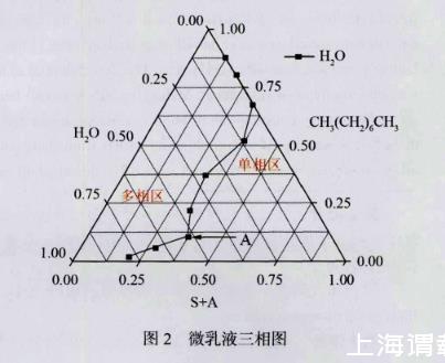 室內(nèi)研究中選用表面活性劑和助表面活性劑組合(S+A)為Tween 80、十八烷基二甲基溴化銨和正丁醇,油相為正辛烷,乳化溫度設(shè)為75℃時(shí),制備WinsorⅣ型單相納米乳液;其中,S+A與油相正辛烷按9∶1、8∶2、7∶3、6∶4、5∶5、4∶6、3∶7、2∶8和1∶9依次混合,然后逐滴加入蒸餾水,觀察加入蒸餾水后乳液的澄清渾濁現(xiàn)象來(lái)確定H2O/(S+A)/正辛烷體系單相微乳液的微觀結(jié)構(gòu)類型,得到的相圖如圖2所示。選取三相圖中A點(diǎn)的微乳液用蒸餾水定容稀釋并以60 Hz頻率超聲波震蕩5 min后,制得納米乳液NR-A。