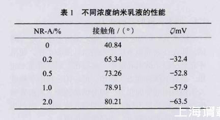 研究測(cè)試納米乳液NR-A在致密砂巖巖心表面的接觸角和Zeta電位,評(píng)價(jià)其在致密砂巖巖心表面的潤(rùn)濕情況和穩(wěn)定性,為含油廢物的脫附剝離提供判斷依據(jù),測(cè)試結(jié)果如表1所示。