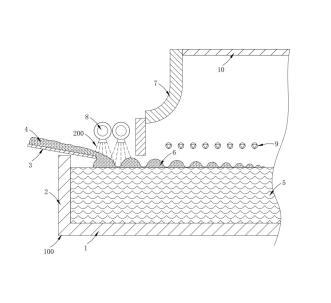 優(yōu)選的,所述窯外噴射方式為玻璃配合料4經(jīng)往復(fù)式投料機3加入窯爐100的投料池后,料堆6漂浮在熔融的玻璃液5上方,在料堆6被推入窯爐100內(nèi)前,將消泡劑200均勻噴撒在漂浮的料堆6表面。