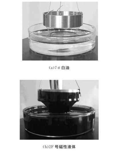 力敏傳感器定標(biāo)數(shù)據(jù)見表1,使用Origin軟件對(duì)直線進(jìn)行擬合,可得力敏傳感器靈敏度B=7.727V/N.測(cè)量無(wú)外加磁場(chǎng)作用的磁性液體表面張力系數(shù)時(shí),為直觀觀察拉脫時(shí)液膜的變化過(guò)程,將培養(yǎng)皿放置于電磁線圈端部進(jìn)行測(cè)量,圖3為拉脫過(guò)程中某一瞬間液膜的收縮狀態(tài),從圖中可看到,磁性液體的液膜拉得更長(zhǎng),液膜收縮的趨勢(shì)比白油更明顯,這主要是因?yàn)榇判砸后w中加入的表面活性劑降低了其表面張力。可從表面張力形成原理來(lái)分析其中的原因:第一,液體表面張力系數(shù)的大小宏觀上反映出液體表面具有自動(dòng)收縮的趨勢(shì),表面張力系數(shù)較大的白油由于分子和分子之間的引力較大,表面層分子更容易向液體內(nèi)部運(yùn)動(dòng),某一拉力作用下,液膜斷裂,不易拉起較長(zhǎng)的液膜;第二,不同液體對(duì)同一種固體的浸潤(rùn)程度不一樣,表面張力系數(shù)小的液體(0.03N/m左右),幾乎能浸潤(rùn)一切固體;表面張力系數(shù)較大的液體,只能浸潤(rùn)某些固體;7#白油的表面張力系數(shù)大于磁性液體,片狀吊環(huán)和磁性液體的結(jié)合力大于片狀吊環(huán)和7#白油的結(jié)合力;液膜不容易和片狀吊環(huán)脫離,拉起來(lái)的液膜比較長(zhǎng)。