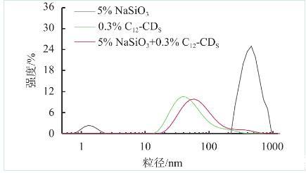 為進一步明確兩親性碳點對硅酸鹽溶液的潤滑機理,通過動態光散射儀(Malvern Zetasizcrnano ZS90,Malvern,英國)測定硅酸鈉溶液、硅酸鈉與兩親碳點和硅酸鈉與聚氧乙烯型表面活性劑的混合溶液水動力學直徑,其中散射角為173°,測試溫度為30℃。如圖6所示,質量分數為5%的Na2SiO3粒徑分布在220~800 nm之間,平均粒徑約為514.0 nm;質量分數為0.3%的C12-CDS溶液的粒徑主要分布在8~100 nm之間,平均粒徑為43.4 nm;而5%Na2SiO3+0.3%C12-CDS的混合溶液粒徑為10~120 nm,平均粒徑為63.2 nm,C12-CDS的加入使得Na2SiO3聚集體的尺寸大大降低,這表明C12-CDS可以讓Na2SiO3聚集體解聚,這與表面活性劑對膠體溶液的分散作用相關。由于大量C12-CDS分子或膠束吸附在Na2SiO3聚集體表面形成具有機械阻礙作用的水化膜,可對Na2SiO3聚集體起到穩定分散作用。