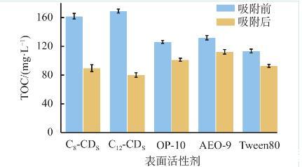 圖5兩親性碳點和聚氧乙烯型表面活性劑在吸附前后的TOC值(c=200 mg/L)