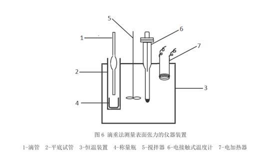 滴重法是利用液滴重量與支持它的表面張力的力相平衡進行測定的試驗。主要也是因為表面張力與液滴重量、滴管半徑、液體密度及重力加速度相關。滴重法要使用到的儀器主要玻璃滴管、恒溫裝置、平底試管、稱量瓶、攪拌器、電接觸式溫度計、電加熱器等。試驗步驟也是先配置測定溶液,清洗測量儀器,然后安裝好實驗裝置,啟動攪拌器,調節接觸溫度計,至所需溫度,使水恒溫半小時,要求普通溫度計的誤差不超過±0.5 ℃。恒溫足夠時間以消除平底試管內與水溫的差,一般溫差小于 1 ℃。用分析天平稱得潔凈干燥的稱量瓶空瓶重。放入浸入恒溫裝置的平底試管內。將橡皮管套于移液管的未加工端,用吸球將待測液吸入移液管內,用夾子夾住橡皮管不使待測液滴下然后將移液管垂直懸掛入恒溫裝置內的試管中,但不可與稱量瓶接觸。恒溫半小時后,慢慢旋開夾子,讓液體自然滴下,調節水滴的下落速度至每滴 100-120 s。至20 滴時擰緊夾子,取出移液管。將稱量瓶稱重,減去空的稱量瓶重量,求得每液滴的重量。在同一溫度下重復兩次。對于表面張力能隨時間迅速變化的或者界面能夠迅速相互飽和的界面,測定精度為±0.1%。