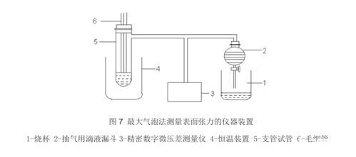 最大壓力氣泡法的原理是將毛細管端浸入液中,通過增加內壓便產生氣泡,然后從管端成長的氣泡的最大泡壓可求出液體的表面張力。 最大壓力氣泡法使用的儀器主要為燒杯、抽氣用滴液漏斗、精密數字微壓差測量儀、恒溫裝置 、支管試管、毛細管等。檢測步驟當然也先制樣,然后清洗儀器,之后檢驗儀器,調節毛細管或液面高度,使毛細管口與水面相切。打開活塞抽氣,調節抽氣速度,使氣泡由毛細管尖端成單泡出,且每個氣泡形成的時間約為 6s-10s。在形成氣泡的過程中,液面半徑經歷:大→小→大,同時壓力差計指示值的絕對值經歷:小→大→小的過程,記錄下絕對值最大的壓力差三次,取其平均值。最大壓力氣泡法每次測量前應注意:一定要用待測溶液清洗支管試管和毛細管,并振蕩洗滌。