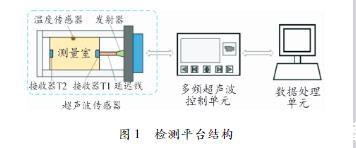 超聲波發射器、溫度傳感器、測量室和超聲波發射器組成,其中位于測量室兩端的2個超聲波接收器用于接收在變壓器油中傳播的超聲波信號,超聲波發射器進行信號發射。為保證超聲波實驗檢測的精度,變壓器油的多頻超聲檢測是在27.5℃的水浴恒溫環境中進行的,由位于測量室的溫度傳感器進行監測。數據處理單元通過數字信號處理電路與多頻超聲控制單元進行連接,用于處理多頻超聲波接收模塊接收到的超聲波信號。經過數據處理單元處理的超聲波信號,主要包括不同接收器所接收到的超聲波信號的幅值、相位以及超聲波信號在油中傳播時的聲速和飛行時間。