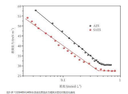 圖3 25℃時SAES和AES水溶液的表面張力隨其濃度的對數(shù)變化曲線