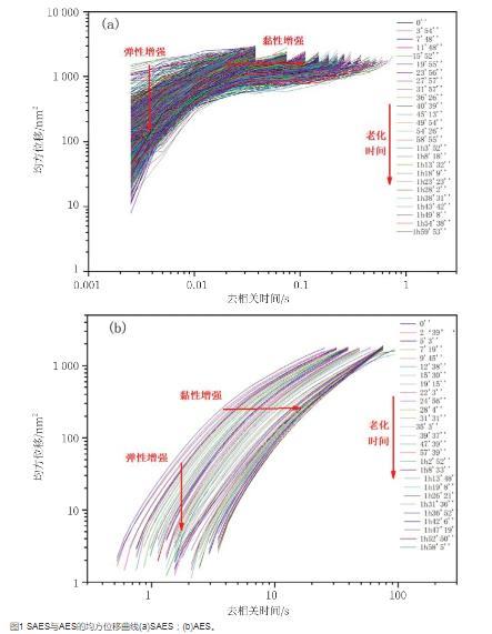 微流變可以通過跟蹤粒子的布朗運動獲得均方位移(mean square displacement,MSD)值測量樣品的黏彈性特性。從圖1中可以看出,隨著樣品老化時間的增加,SAES和AES的MSD曲線都是首先由長位移向短位移轉(zhuǎn)變,即彈性增加,粒子間碰撞增加;去相關(guān)時間由短向長的MSD曲線變化,表明二者的黏度增加。SAES和AES在樣品老化過程中,其結(jié)構(gòu)都發(fā)生了變化,黏彈性都有所增加。從圖1中還可以看出,SAES和AES的黏彈性差別較大,在老化過程中SAES黏彈性變化較小,而AES的黏彈性變化較大。