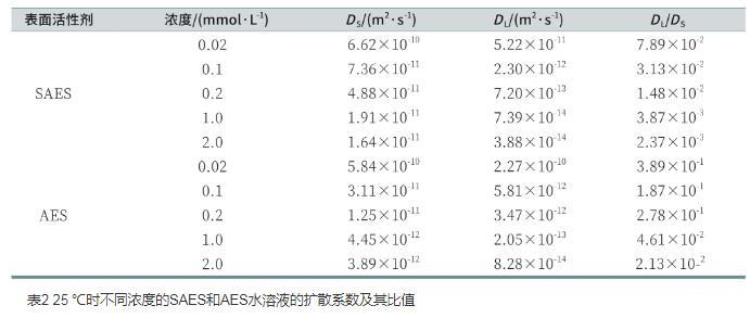 表2 25℃時不同濃度的SAES和AES水溶液的擴散系數(shù)及其比值