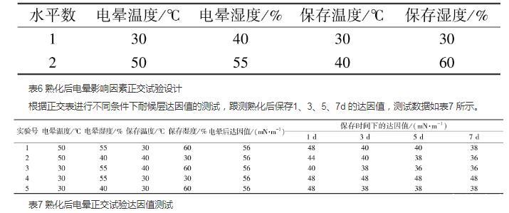 本文通過JMP軟件定制熟化前后電暈正交試驗設計,發現熟化溫度影響最顯著,熟化環境的濕度對耐候層表面張力影響第二顯著,反應程度第三顯著,電暈溫度無明顯影響。在40℃條件下,對熟化濕度進行單因素分析,控制熟化濕度低于40%,基本上能使耐候層表面張力達到38 mN/m。熟化后電暈與熟化前電暈相比,在相同的保存時間內,熟化后電暈達因值較大。
