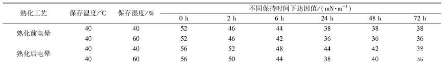 當處于相同的保存溫度及保存濕度(40℃/60%)下,電暈后在此環境下熟化24 h后,耐候層達因值即從初始電暈52 mN/m降低到36 mN/m。與之相比,先進行熟化后再電暈后,在此溫濕度環境下保存24 h仍可維持38 mN/m以上的水平。隨著保存環境濕度的降低(40℃/40%),熟化前電暈保存24 h后,達因值可保持在38 mN/m,熟化后電暈在較低溫濕度環境下保存24 h達因值可維持在44 mN/m以上,當保存72 h后達因值仍可保持在38 mN/m以上。因此,當處于相同的保存環境及相同保存時間下,背板熟化后電暈比熟化前電暈耐候層達因值保持更好,維持時間更長。