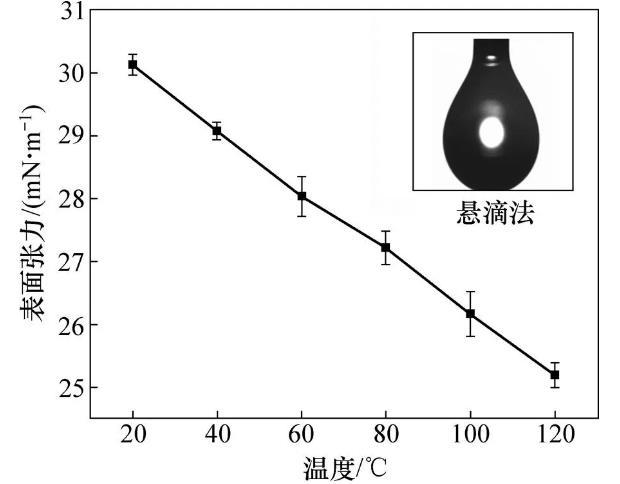 采用瑞典Biolin Scientific Theta光學接觸角測量儀的懸滴法測量20,40,60,80,100和120℃溫度下DBTL的表面張力。將DBTL緩慢從自制滴管中滴出,當液滴外形出現輕微縮頸時,保溫30 s,測量該狀態下表面張力,每個溫度點測5次求算術平均值作為該溫度下表面張力。