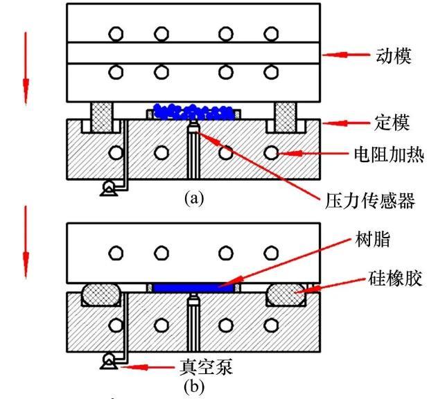 測定薄板分別由2種材料CBT500和PP制成,用于一定溫度下不同材料液滴在相應薄板上靜態接觸角的測量。采用抽真空熱壓工藝制備光滑薄板,成型工藝參數如表1所示,具體過程為:采用信易SCD?20μ/30H干燥機對CBT500和PP顆粒進行干燥,干燥溫度、時間分別為80℃和24 h。采用HH?138的精密烤箱對干燥后CBT500和PP顆粒分別進行預加熱,加熱溫度分別為140℃和160℃,加熱時間均為0.5 h。將預加熱CBT500和PP顆粒分別倒入溫度為130℃和150℃的模具中,采取抽真空熱壓工藝制備CBT500和PP光滑薄板。抽真空熱壓工藝包括6個階段:1)動模降至密封圈;2)抽真空;3)施壓;4)保壓;5)冷卻;6)開模取件。為獲得良好的密閉空間,動模應迅速下降至密封圈并微壓,如圖2(a)所示。抽真空后,施加壓力將CBT500和PP顆粒壓實,制成相應光滑薄板,如圖2(b)所示。