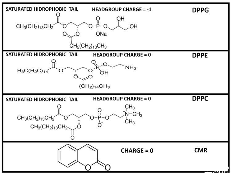 圖 2. 磷脂和香豆素分子結構。 DPPC 和 DPPC 具有圓柱形分子形狀,而 DPPE 具有錐形幾何形狀。