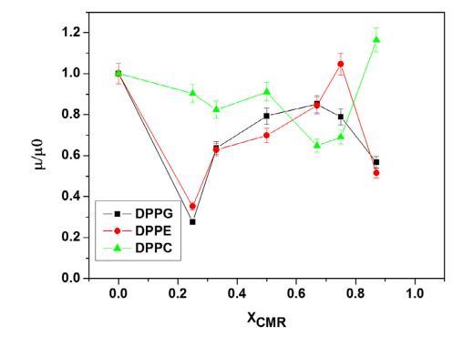 分子面積作為 CMR/ DPPG如圖5a所示。 可以看出負偏差 mma (XCMR = 0.33–0.67) 由于分子吸引力相互作用的增加。 CMR/DPPG 薄膜被認為是部分混溶和非理想的浮動單層,因為線性度不高 觀察到的。 CMR/DPPE 混合薄膜的結果在 XCMR=0.25 和 0.67 時表現出不同的斷裂點(圖 5b)。 DAE 節目 包裝效率甚至幾何形狀的改進 調節發生在較低的 XCMR(圖 6)(Andrade 等人, 2006; 周和張,2000)。