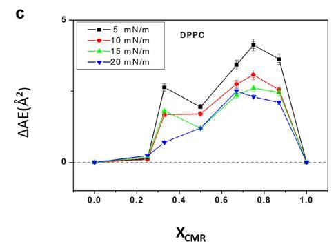 純和混合單層的 pA 等溫線與分子面積的關系如圖 1 所示。CMR/DPPG 等溫線顯示出與純 DPPG 脂質相似的趨勢(圖 1a)。 相似相 對所有 CMR/DPPG 混合物都觀察到了轉變。 DPPG 和 DPPC 顯示崩潰壓力 (DPcoll) 為 52 mN.m-1 次方和 60 mN.m-1次方 , 分別。 一個過渡 (p ffi 3 mN.m-1次方 ) 從液體 發現純 DPPE 單層膨脹為凝聚相 與 D. coll 在 ffi55 mN.m-1次方 . 為 D. coll 獲得的值 純脂質與文獻一致(Vollhardt 等人, 2000; 諾沃塔斯卡等人,2014 年)。