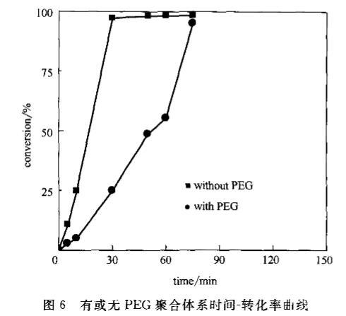 圖6有或無PEG聚合體系時(shí)間一轉(zhuǎn)化率曲線
