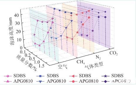 對比同一種溶液通入不同氣體的高度進行分析,空氣、氮氣及二氧化碳注入液體發泡性規律基本一致,均在質量分數最高時發泡率達到最大。通入甲烷時則在SDBS溶液質量分數為0.02%時就達到了與0.15%接近的發泡高度。APG0810在甲烷注入時也比其他氣體總體發泡率高,這是由于甲烷的摩爾質量最低,氣體密度低,分子擴散快,泡沫膨脹速率變快導致的。