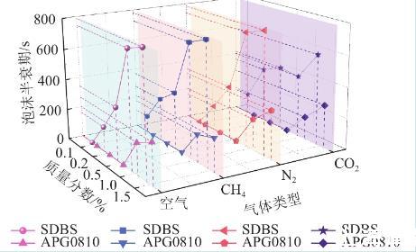 空氣、甲烷及氮氣的穩泡性規律大致相同,注入空氣情況下,SDBS溶液質量分數為0.15%時泡沫半衰期約為786.5 s,二氧化碳注入液體的穩泡性明顯下降,質量分數為0.15%時為584 s,比空氣低202.5 s。推測這是由于二氧化碳為酸性氣體,表面活性溶液在酸性環境下泡沫穩定性不足,泡沫液膜強度不易控制酸性氣體造成的。而APG0810表面活性劑溶液泡沫半衰期在四種氣體注入情況下差異不明顯,是由于APG0810為非離子表面活性劑,在溶液中不是以離子狀態存在,由此可以推出它的穩定性高,不易受強電解質影響,也不易受酸、堿影響。