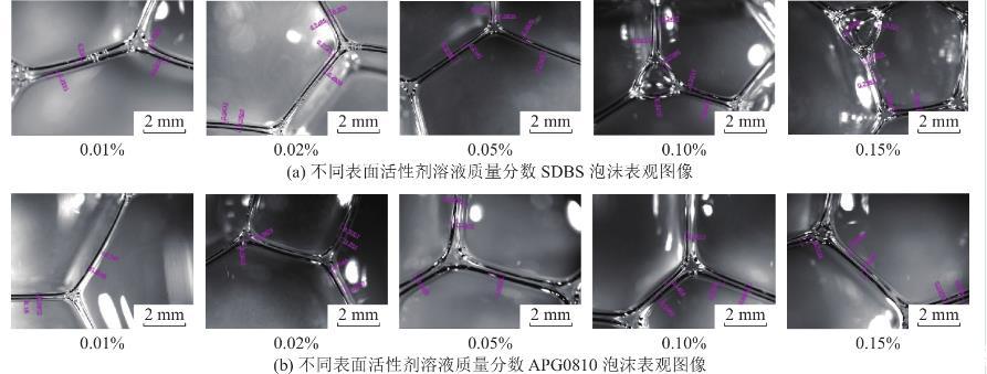 顯微鏡觀察泡沫形態如圖6所示,測量泡沫液膜厚度,得到如圖7所示變化圖。2種表面活性劑泡沫液膜厚度隨溶液質量分數增加均有增加趨勢,SDBS溶液質量分數為0.1%和0.15%時泡沫中出現了明顯微小泡沫液膜結構,意味著泡沫液膜數量逐漸增多。