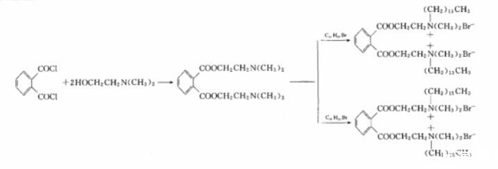 鄰苯二甲酰氯與過量的N,N-二甲基乙醇胺反應生成二(二甲基胺基乙基)鄰苯二甲酸酯(Ⅰ),二鄰苯二甲酸酯(Ⅰ)再分別與正溴代十四烷和正溴代十六烷反應,得到雙季銨基鄰苯二甲酸酯Gemini表面活性劑。反應式見圖1。