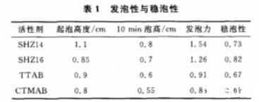由表1可見:SHZ16的發泡性比SHZ14差,但穩泡性要好于SHZ14,原因可能是隨著泡沫的生成,液體的表面積增加,表面能增加所消耗的能量增加,而且SHZ16的分子比SHZ14的大,那么單個分子的表面積就大,需要克服表面能消耗的能量也大,因此起泡性要差些而穩泡要優于SHZ14。