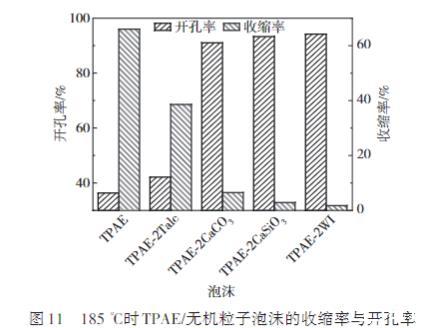 圖11 185℃時TPAE/無機粒子泡沫的收縮率與開孔率