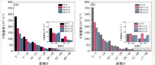從圖3中可以觀察到,隨著齡期的延長,干縮曲線SRA2-UV逐漸接近于干縮曲線SRA3-UV,而SRA3-UV的干縮值沒有進(jìn)一步降低。這表明上述分析是合理的。在強(qiáng)紫外線輻射下,當(dāng)減縮劑的摻量超過3%時(shí),其孔隙溶液中的SRA濃度超過臨界濃度(CMC),進(jìn)一步增大摻量不能增強(qiáng)SRA在該應(yīng)用環(huán)境中的減縮效果。