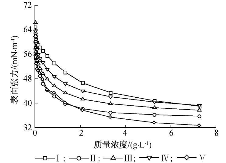 由表1可知,5種高分子表面活性劑的重均相對分子質(zhì)量在1 643~5 267之間,萜烯馬來酸酐與聚乙二醇2 000反應得到的表面活性劑重均相對分子質(zhì)量最大,表面活性劑的聚合度隨著聚乙二醇相對分子質(zhì)量的增大呈先增大后減小的趨勢,化合物Ⅱ聚合度最大,為4.9。
