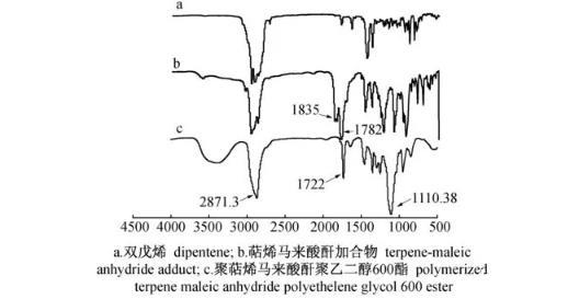 工業(yè)雙戊烯中除了百分之十左右的α-松油烯具有共軛雙鍵能直接與馬來酸酐發(fā)生D-A加成反應外,γ-松油烯、雙戊烯等均需在催化劑作用下發(fā)生異構化,轉(zhuǎn)化為以α-松油烯為主的含有共軛雙鍵的單環(huán)單萜才能與馬來酸酐發(fā)生反應生成萜烯馬來酸酐加合物,萜烯馬來酸酐加合物再分別與聚乙二醇(400,600,1 000,2 000,4 000)進行反應得到對應的目標產(chǎn)物,分別為聚萜烯馬來酸酐聚乙二醇400酯(Ⅰ),聚萜烯馬來酸酐聚乙二醇600酯(Ⅱ),聚萜烯馬來酸酐聚乙二醇1000酯(Ⅲ),聚萜烯馬來酸酐聚乙二醇2000酯(Ⅳ)和聚萜烯馬來酸酐聚乙二醇4000酯(Ⅴ)。