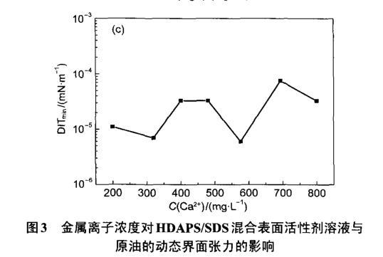 圖3金屬離子濃度對HDAPS/SDS混合表面活性劑溶液與原油的動態界面張力的影響