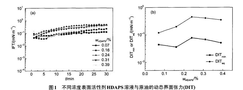 圖1不同濃度表面活性劑HDAPS溶液與原油的動態界面張力(DIT)