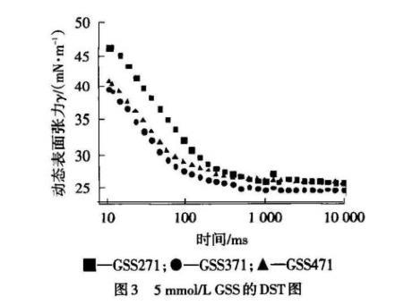 當(dāng)溶液濃度c為1 mmol/L(c<cmc)時,由圖2可知,表面活性劑GSS271、GSS371和GSS471均表現(xiàn)為典型的DST變化曲線,即開始時DST接近溶劑的表面張力,后隨時間延長先快速下降,下降至一定數(shù)值后降速緩慢,最后DST基本保持不變。因?yàn)槲絼傞_始時GSS在新鮮的氣液界面吸附量很少,所以界面張力接近溶劑的表面張力,隨著時間的推移,GSS分子逐漸吸附在界面,氣液界面張力降低;隨著吸附的進(jìn)行,界面逐步趨于飽和,吸附推動力減小,GSS分子在界面吸附速率下降,因而DST下降緩慢最后趨于介平衡。GSS分子在界面達(dá)到飽和后還需進(jìn)一步吸附與定向排列,因而DST曲線中的介平衡張力較對應(yīng)濃度下的靜態(tài)表面張力大。當(dāng)溶液濃度為5 mmol/L時,由圖3僅觀察到DST快速下降區(qū)和介平衡區(qū)。因?yàn)闈舛容^高(c>cmc),開始時便有較多的表面活性劑分子被吸附到表面,所以DST低于溶劑表面張力。