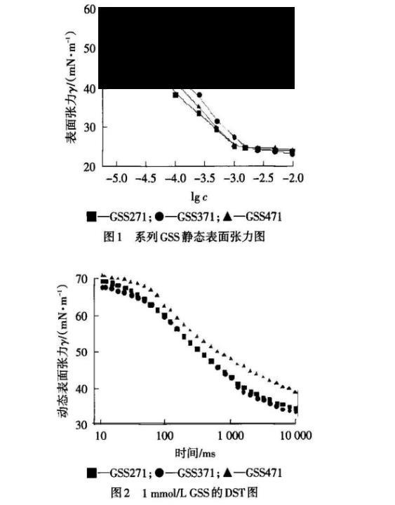 雙磺基琥珀酸酯磺酸鈉(簡稱GSS)通過柔性連接基將兩個傳統(tǒng)的琥珀酸酯鹽連接而成,連接基使GSS分子中兩個離子頭基間的靜電斥力大大削弱,同時加強(qiáng)了碳?xì)滏滈g的疏水結(jié)合力,使GSS具有比單鏈琥珀酸酯磺酸鹽更低的臨界表面張力。