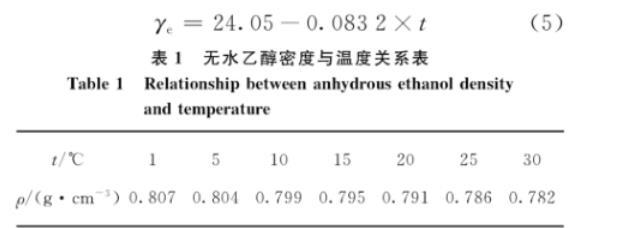 毛細(xì)管的實(shí)際內(nèi)半徑r與生產(chǎn)標(biāo)號NRI有一定差異,需進(jìn)行標(biāo)定。文中毛細(xì)管內(nèi)半徑在0.08——0.50mm范圍內(nèi),難以直接測定。利用式(2),選擇無水乙醇作為標(biāo)定液,內(nèi)半徑較粗、可測的毛細(xì)管作為基準(zhǔn)管,反向標(biāo)定較細(xì)毛細(xì)管的內(nèi)半徑。標(biāo)定過程為:(1)通過電荷耦合器件(CCD)相機(jī)拍攝,并獲取基準(zhǔn)管的內(nèi)半徑。(2)使用相機(jī)拍攝毛細(xì)管內(nèi)液面上升高度,以及無水乙醇與管內(nèi)壁的接觸角;(3)記錄試驗(yàn)溫度t.根據(jù)無水乙醇的表面張力計(jì)算公式和溫度~密度特性表獲得其表面張力γe與密度ρ,見式(5)和表1.(4)將上述參數(shù)代入式(2),得到毛細(xì)管的內(nèi)半徑值。