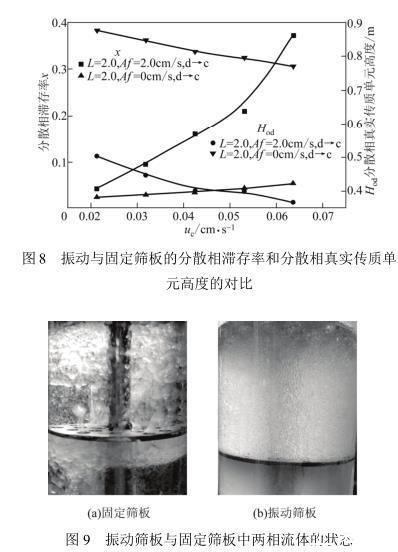 圖8給出了正丁醇-丁二酸-水體系分別在振動篩板塔與固定篩板塔中的分散相滯存率和分散相“真實”傳質單元高度的對比。圖中顯示振動篩板塔中分散相滯存率x明顯高于固定篩板塔中的x,傳質單元高度Hod遠低于固定篩板塔的Hod,而且振動篩板塔的x受連續相流速影響大,固定篩板塔的x受流速的影響微乎其微。這是由于兩種塔的萃取狀態不同(圖9),固定篩板塔的操作處于混合-澄清區[圖9(a)],振動篩板塔的操作處于分散區[圖9(b)]。
