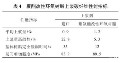 采用聚氨酯改性環氧樹脂上漿劑制備的碳纖維性能見表2。