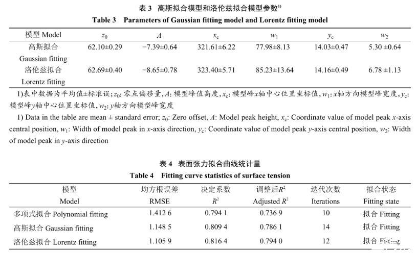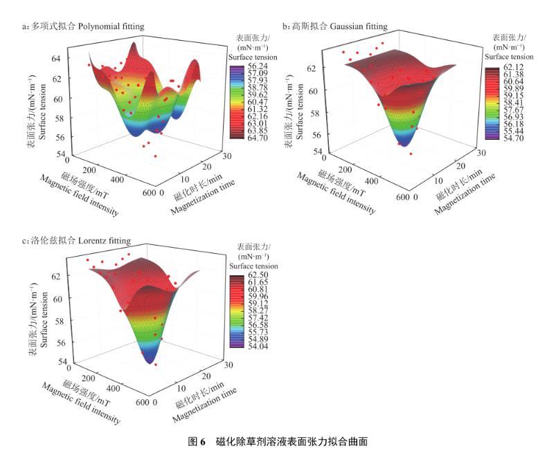 結合觀測3種擬合模型的曲面圖,得出洛倫茲擬合模型最優(圖6)。除草劑溶液表面張力與磁場強度和磁化時長的關系式見公式(4),為研究磁化作用對除草劑溶液表面張力的影響提供理論參考。