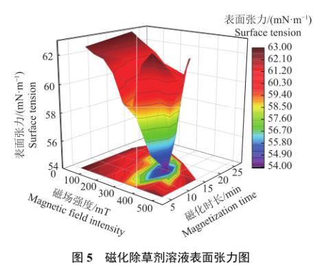 為了直觀地分析磁場強度和磁化時長2個因素共同作用對除草劑溶液表面張力的影響規律,建立以磁場強度和磁化時長為自變量、以溶液表面張力為因變量的二元函數,使用OriginPro 2018繪制磁場強度和磁化時長對表面張力影響規律的空間曲面分布圖(圖5)。由圖5可以看出,磁場強度和磁化時長對溶液表面張力影響規律的空間曲面分布圖呈峰值為負值的高斯空間分布規律,即空心圓錐面分布,這說明并不是磁場強度越大或者磁化時間越長,除草劑溶液的表面張力就越小,而是存在處理效果最佳的磁場強度和磁化時長。磁化除草劑溶液表面張力試驗結果見表2。當磁場強度為350 mT、磁化時長為15.0 min時,除草劑溶液表面張力值最小,為54.0 mN/m,下降14.96%,磁化效果最佳。
