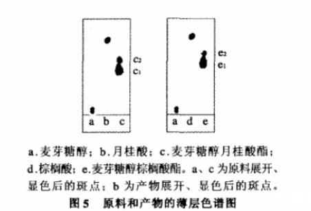 圖5為展開劑展開后的薄層色譜圖。麥芽糖醇月桂酸酯的質譜鑒定:麥芽糖醇(單)月桂酸酯和麥芽糖醇雙月桂酸酯的相對分子質量分別為526.3和708.3,質譜圖中出現549.4峰和731.3峰分別為[M單酯+Na]和[M雙酯+Na]的質譜信號,說明薄層色譜圖5中的c1和c2分別為麥芽糖醇單月桂酸酯和麥芽糖醇雙月桂酸酯。