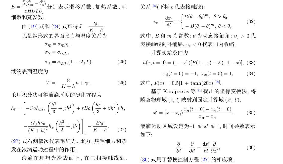 接觸線處的液滴高度為零,即h(x=xcl=xcr,t)=0,其中xcl和xcr分別代表左側(cè)和右側(cè)接觸線位置.采用下式描述接觸線移動速率與接觸角間的關(guān)系[28](下標c代表接觸線):