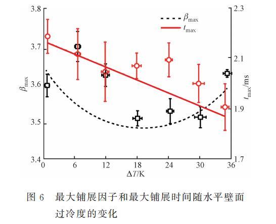 根據液滴鋪展隨時間的變化,提取了不同過冷度下的βmax和tmax并繪制了圖6。如圖所示:隨著水平壁面過冷度的增大,βmax呈現了先減小后增大的非單調變化趨勢,并在水平壁面過冷度為18.0~30.0K時達到最小值;不同于βmax的變化趨勢,tmax呈現逐漸減小的趨勢,這是由于隨著水平壁面過冷度的增加,換熱加劇,液滴的溫度降低,這使得密度、黏度、表面張力增加,抑制了最大鋪展時間。根據Shang等提出的換熱模型,將乙醇液滴看作一個整體,并將液滴沖擊過冷水平壁面的過程看作圓柱形不斷“變矮”和“變寬”的過程,可以得到乙醇液滴沖擊過冷水平壁面的溫度降低范圍為1.8~3.7K。