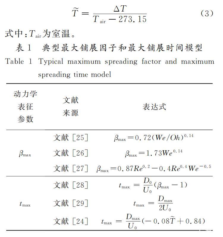 如表1所示,Bayer和Megaridis認為液滴沖擊水平壁面的最大鋪展因子與韋伯數、奧內佐格數有關,并提出了相關關聯式。Roisman認為最大鋪展因子與雷諾數、韋伯數均有關,他采用半假設半理論的方法,從動量守恒理論出發,提出了最大鋪展因子的表達式。針對最大鋪展時間,Wildeman等認為,最大鋪展時間與最大鋪展因子有關,結合實驗數據,對最大鋪展時間進行了修正。Shang等探究了水滴沖擊過冷水平壁面的鋪展動力學行為,并將水平壁面過冷度引入最大鋪展時間模型,重新定義無量綱過冷溫度