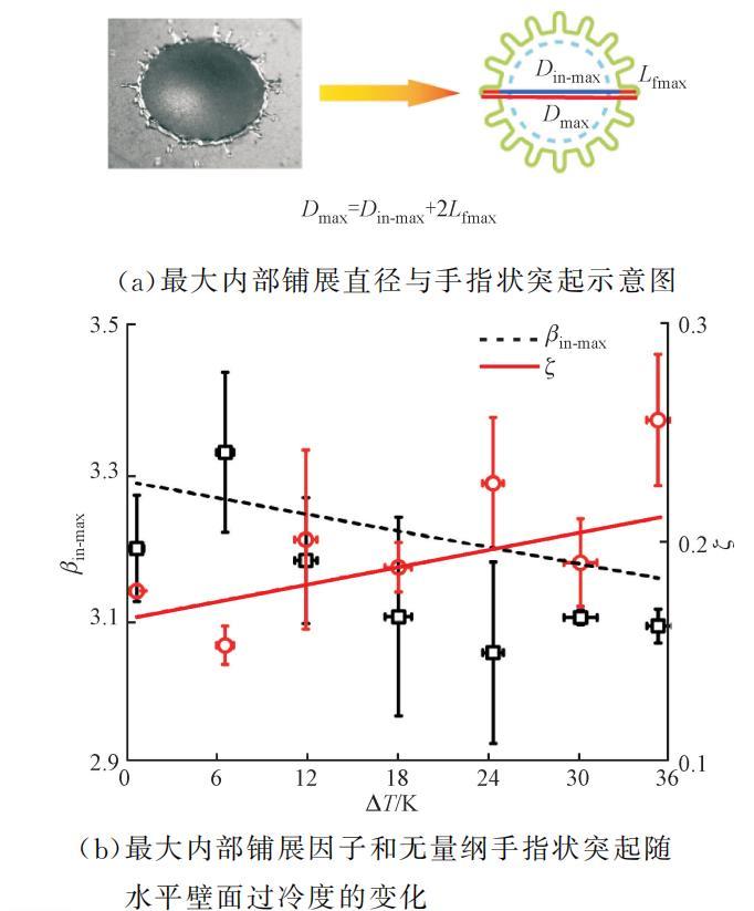 圖7 液滴形狀簡化與最大內部鋪展因子和無量綱手指狀突起隨水平壁面過冷度的變化