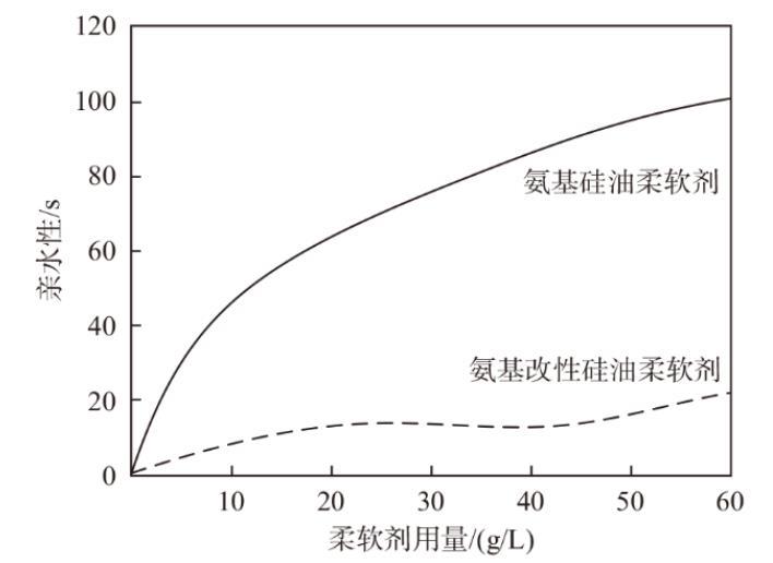 4)當(dāng)用量為20 g/L時,氨基改性硅油柔軟劑親水性為10.4 s;當(dāng)用量為50 g/L時,氨基改性硅油柔軟劑親水性小于20 s,與氨基硅油柔軟劑相比,氨基改性硅油柔軟劑在親水性方面有所改善。