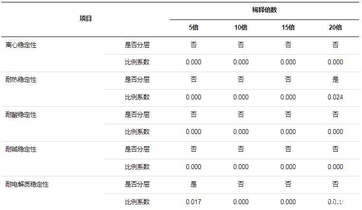 1)經(jīng)過稀釋后,耐熱穩(wěn)定性、耐電解質(zhì)穩(wěn)定性兩個測試項目雖然出現(xiàn)分層情況,但是比例系數(shù)均在0.1以下,氨基改性硅油柔軟劑保持較好的穩(wěn)定性;