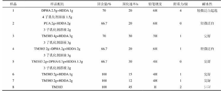 合成的丙烯酸酯改性桐油衍生物既含有可光固化的丙烯酸基團,也含有可經中和形成親水性的基團的羧酸,丙烯酸酯改性的桐油基乳化劑可以光固化,光交聯的乳化劑的水溶性大大下降,固化后的膜材料的耐水性可望得到改善。改性桐油基衍生物及其復配物的光固化結果列于表2。丙烯酸酯改性的桐油衍生物乳化的光固化體系及改性桐油復配的光固化體系在紫外光照下快速固化形成不同硬度的膜,膜的硬度及光固化速度與光固化體系中的丙烯酸酯官能團的含量有關,丙烯酸酯官能團越多,固化越快,膜的硬度也越高。交聯密度過大后會導致膜的附著力下降,丙烯酸酯改性桐油衍生物TM3H3與HDDA、DPHA組合的水乳液具有較快的光固化速度,可形成綜合性能良好的光固化膜。丙烯酸酯改性的桐油衍生物與HDDA直接復配物也具有很好的光固化速度,形成的膜綜合性能較好。丙烯酸酯改性的桐油衍生物及其光固化體系的進一步應用研究還在進行中。