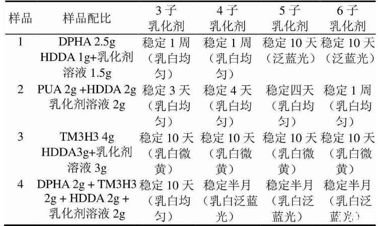 中和后得到的桐油基多子乳化劑能夠乳化黏度較大的光固化單體及低聚物形成穩定的水乳液。不同乳化劑乳化性能不同,其穩定性和外觀也有較大差別,乳液性能列于表1。6子乳化劑乳化的HDDA水乳液(固含量60%)的穩定性能達到3個月以上,乳液長期放置分層后經攪拌能二次乳化形成均勻的乳液。