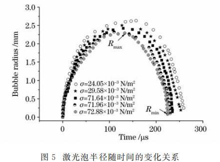 從圖5可以看出,表面張力減緩了空泡的膨脹過程。在初期,空泡膨脹變緩的現象不甚明顯,愈到后期越明顯。液體張力越大,空泡對應的最大泡半徑越小;表面張力加速了空泡的收縮。表面張力越大,空泡收縮所能達到的最小泡半徑越小,且表面張力縮短了空泡脈動周期。從圖5還可以看出表面張力對空泡潰滅的影響要強于對膨脹的影響。此外,激光泡半徑隨表面張力變化與液體的表面張力數值并不為線性關系,其關系有待研究。